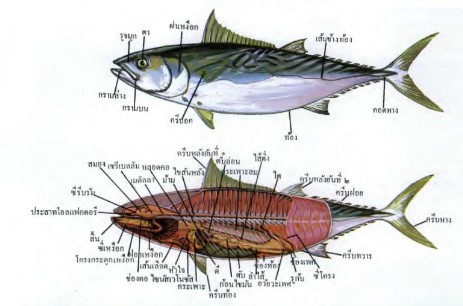 อวัยวะภายในที่สำคัญต่างๆ ของปลาโอลาย ( Mackerel tuna: Euthynnus affinis)