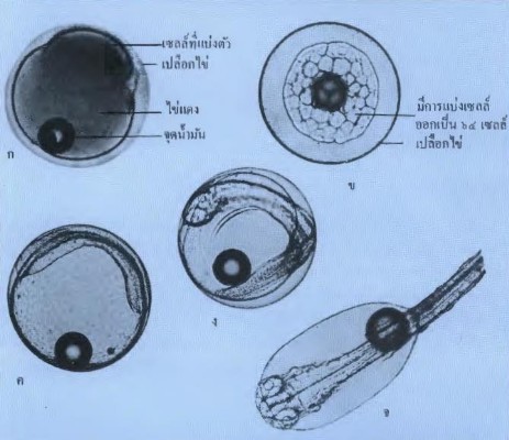 ก. ภาพถ่ายของไข่ปลาทูที่เริ่มมีการแบ่งเซลล์ ภายหลังที่ได้รับการผสมของน้ำเชื่อจากตัวผู้