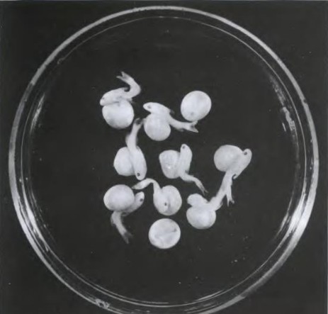 ค. ภายหลังผสมน้ำเชื้อ 13 ชั่วโมง ปรากฏว่าตัวอ่อนเริ่มมีการเจริญเติบโตของเบ้านัยน์ตา
